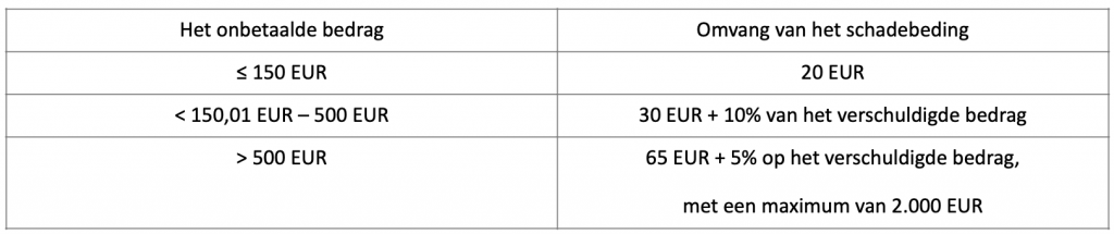 maand, zonder dat een voorafgaande ingebrekestelling vereist is. De bijkomende schadevergoeding bedraagt forfaitair 10% van de